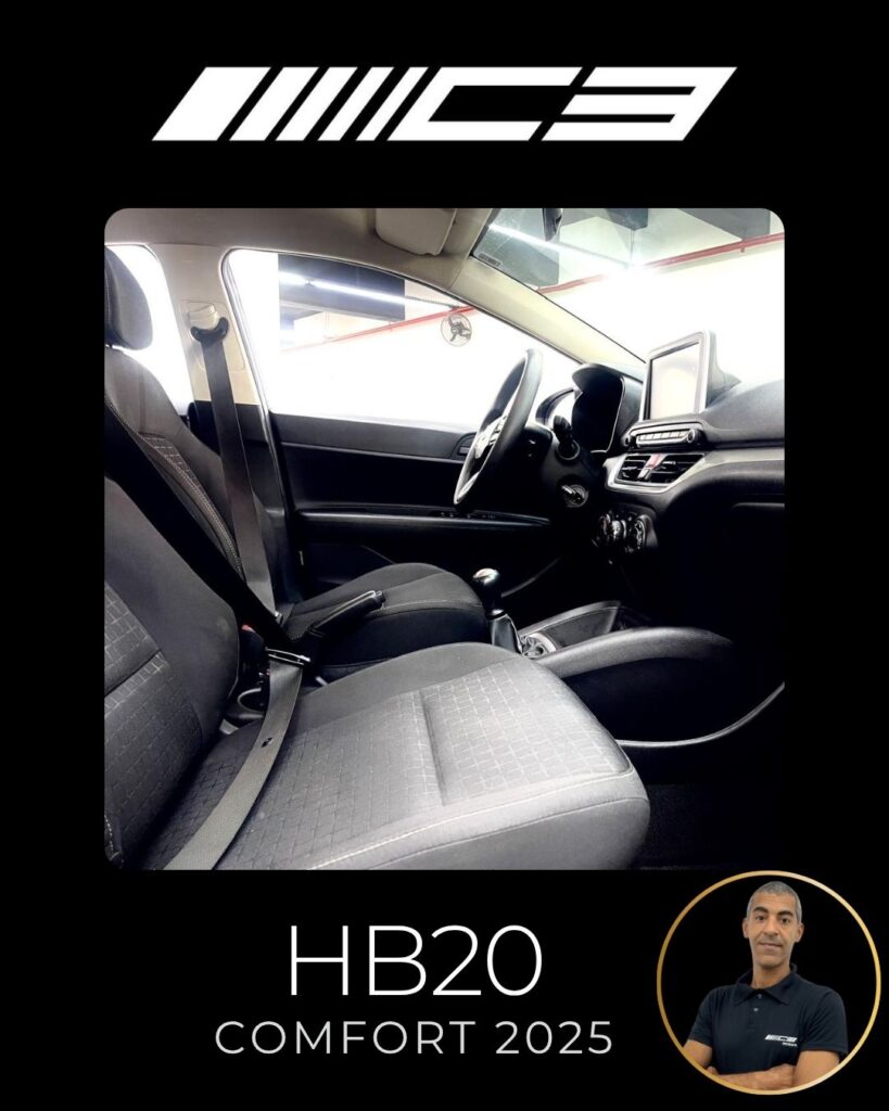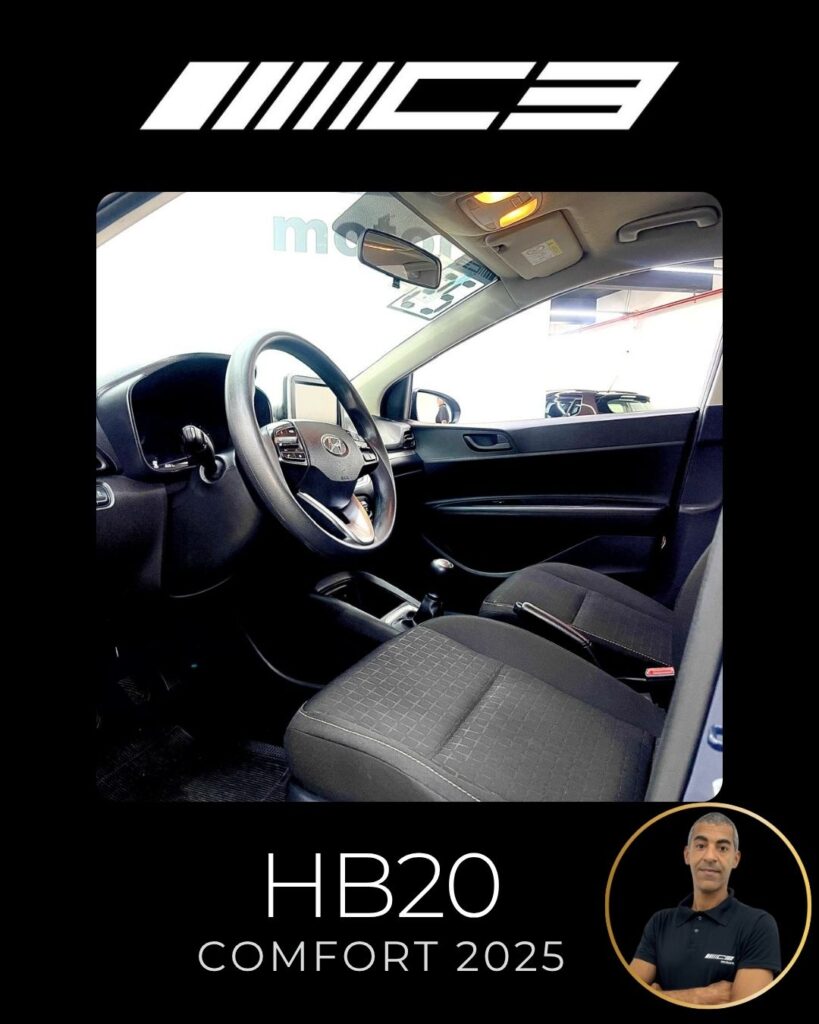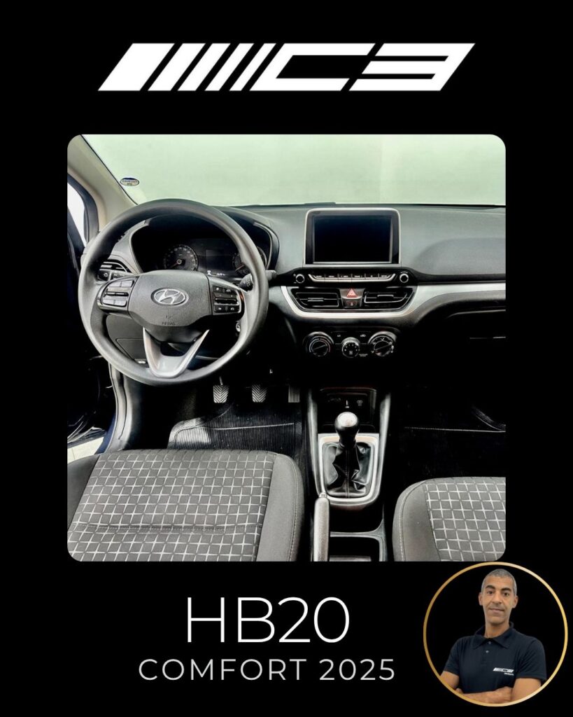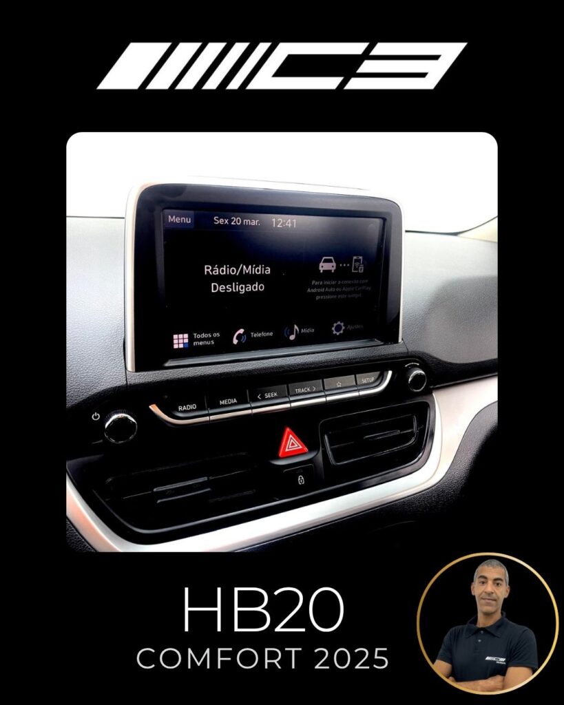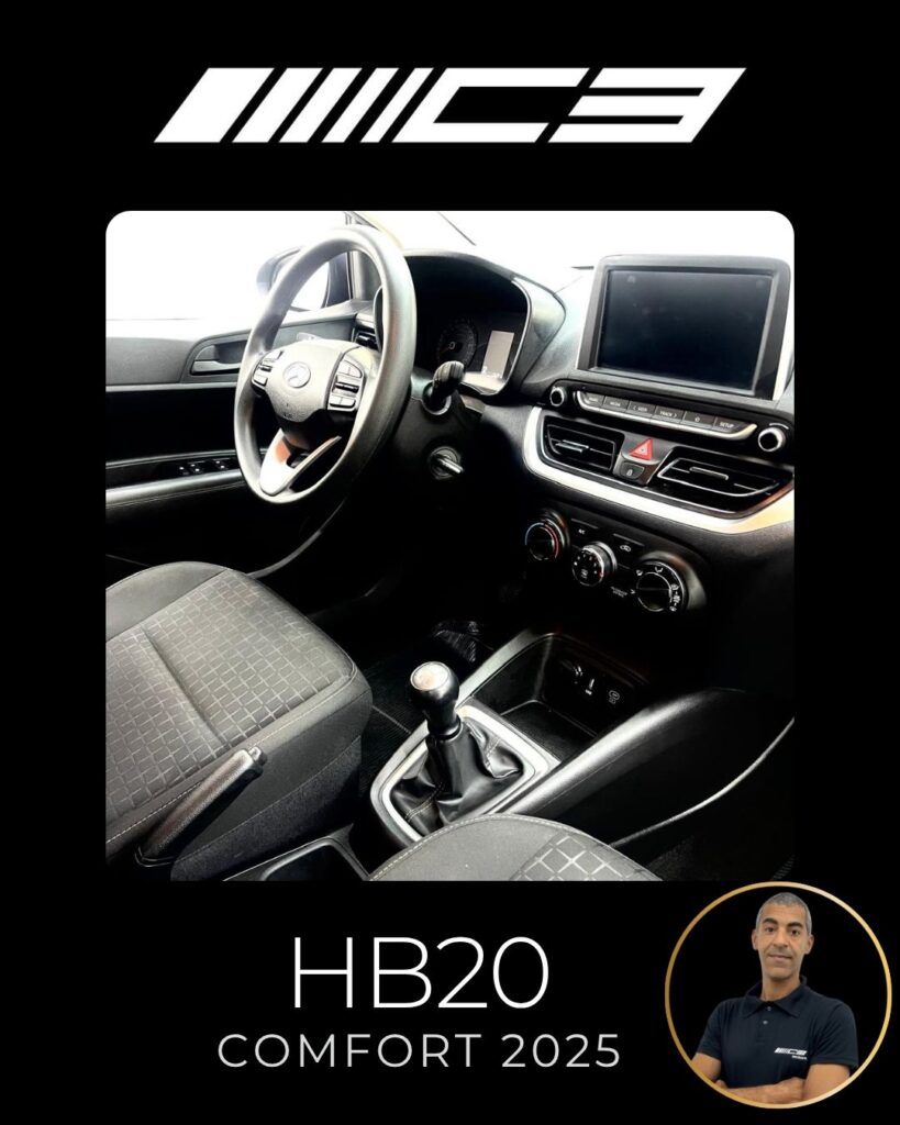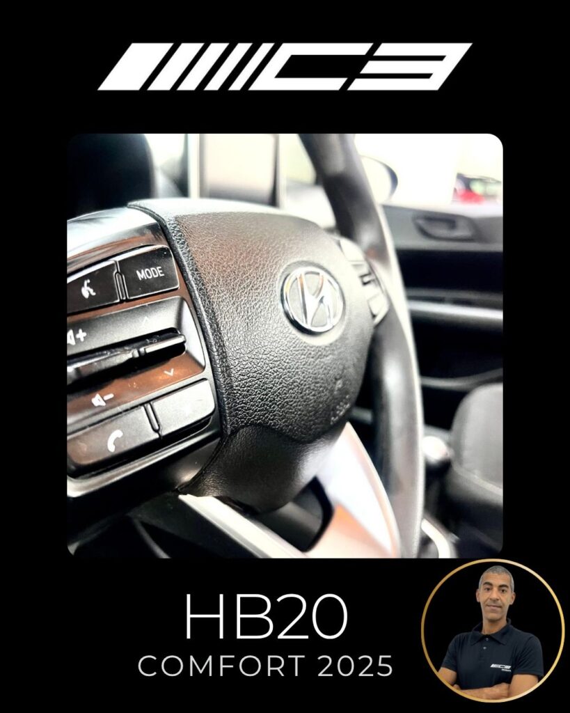 O Hyundai HB20 Hatch Comfort 2025 destaca-se pelo conjunto de conectividade e segurança, trazendo de série central multimídia de 8" com espelhamento sem fio (Apple CarPlay/Android Auto), câmera de ré, seis airbags, controle de tração/estabilidade, rodas de 15" e motor 1.0 Kappa com boa eficiência no trânsito urbano