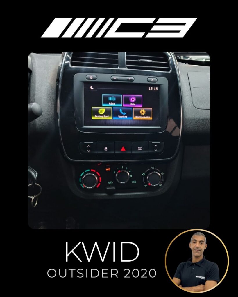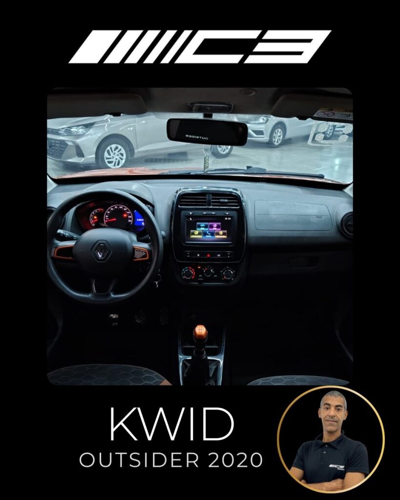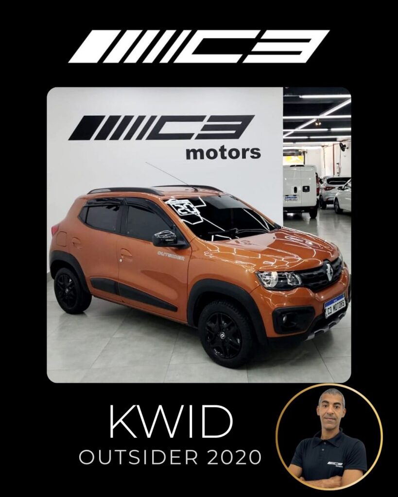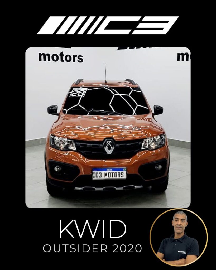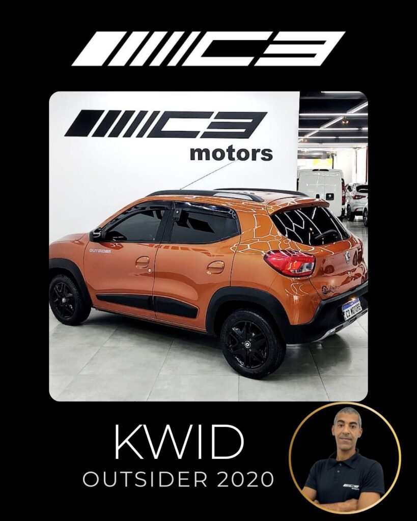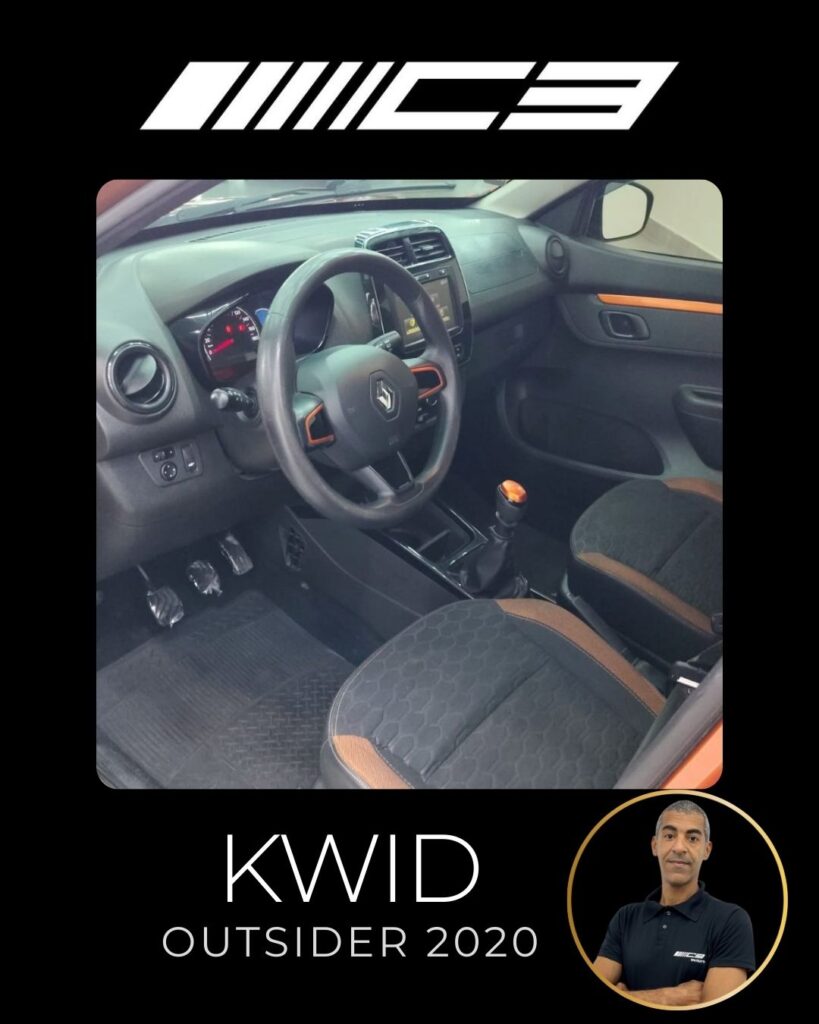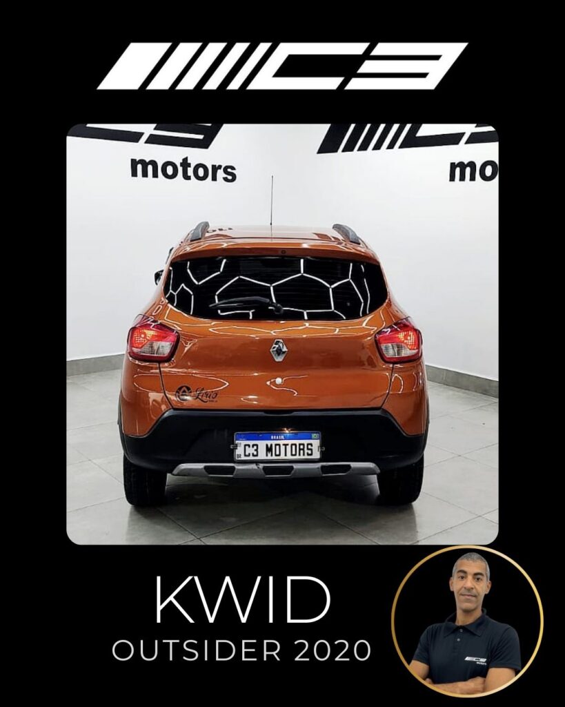 O Renault Kwid Outsider 2020 se destaca pelo visual aventureiro com apliques prateados nos para-choques, molduras pretas (caixas de roda e faróis de neblina), rack de teto, rodas de aço aro 14 com calotas "Black Piano" e bancos com detalhes em laranja. É uma opção compacta, econômica e com boa altura do solo (18,5 cm