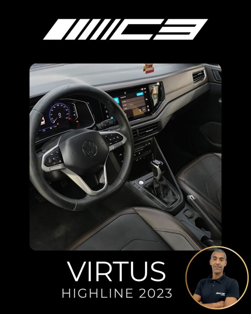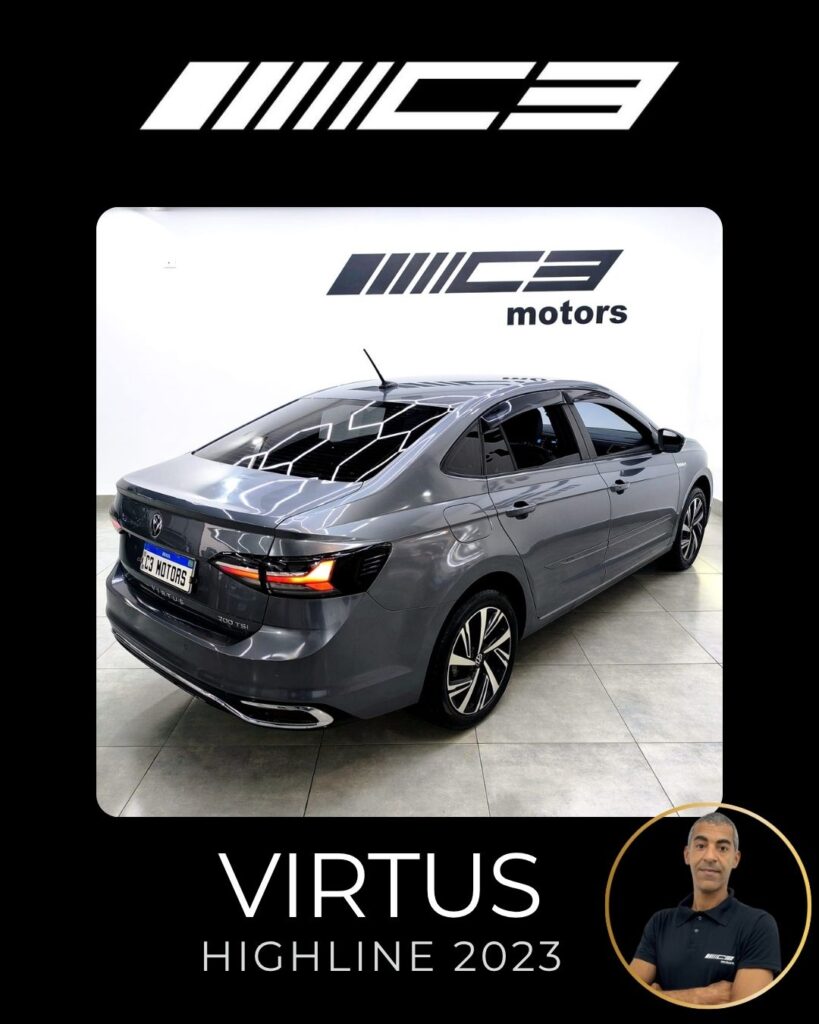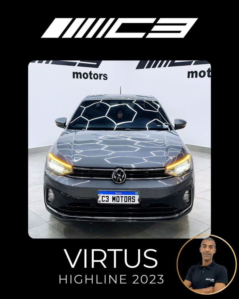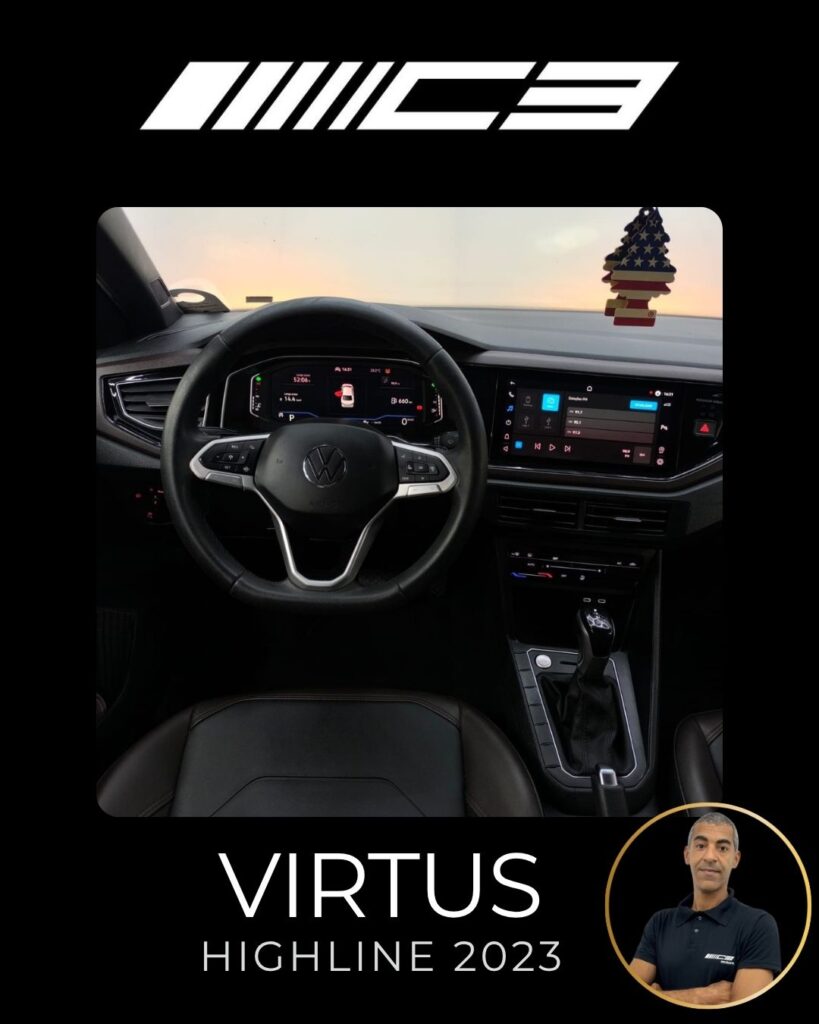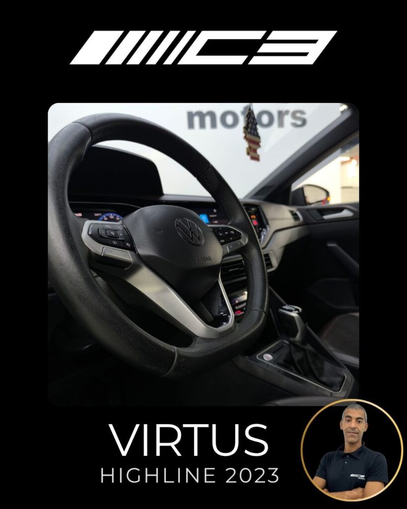 O VW Virtus Highline 2023 destaca-se pelo motor 200 TSI, visual renovado com faróis full LED, painel digital de 10,25”, central VW Play e pacote ADAS (piloto automático adaptativo/frenagem automática). O sedã traz rodas aro 17″, bancos em couro, climatronic touch e, como diferencial, as três primeiras revisões gratuitas