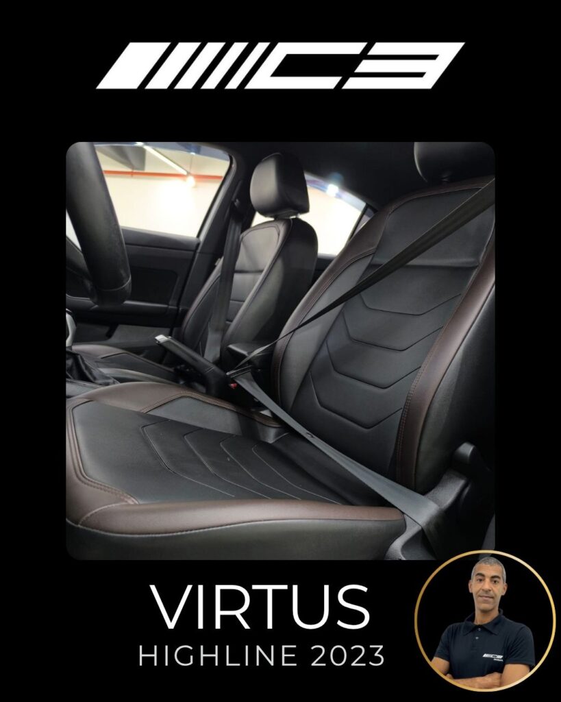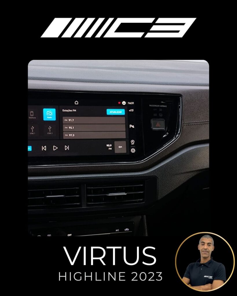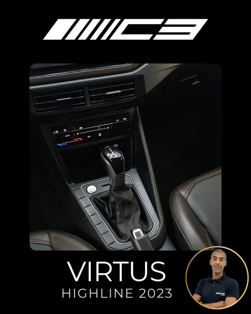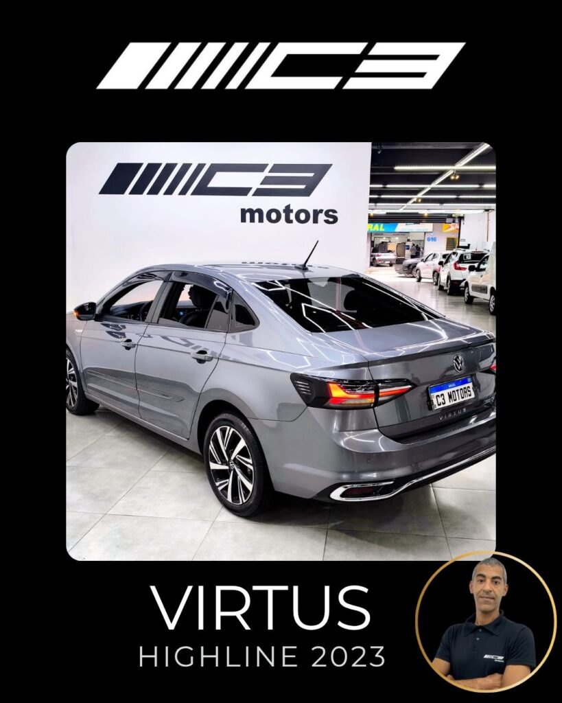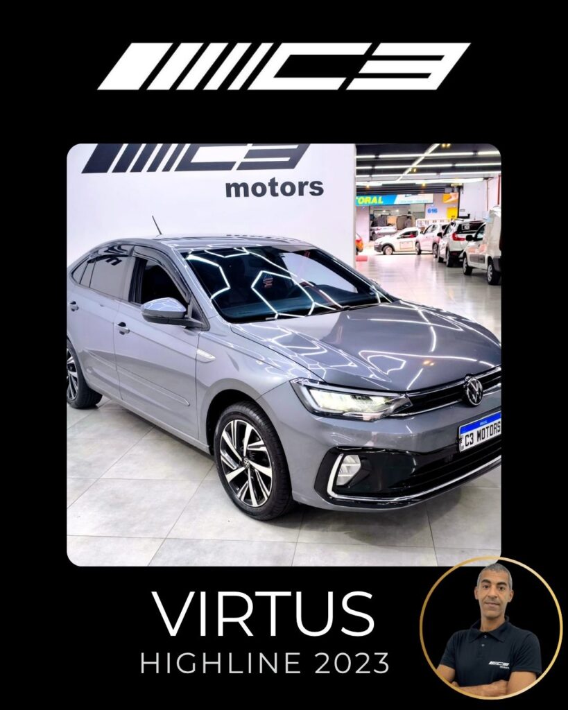 O VW Virtus Highline 2023 destaca-se pelo motor 200 TSI, visual renovado com faróis full LED, painel digital de 10,25”, central VW Play e pacote ADAS (piloto automático adaptativo/frenagem automática). O sedã traz rodas aro 17″, bancos em couro, climatronic touch e, como diferencial, as três primeiras revisões gratuitas