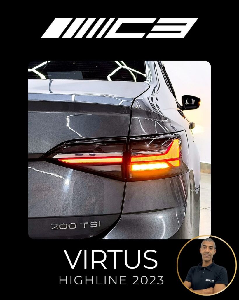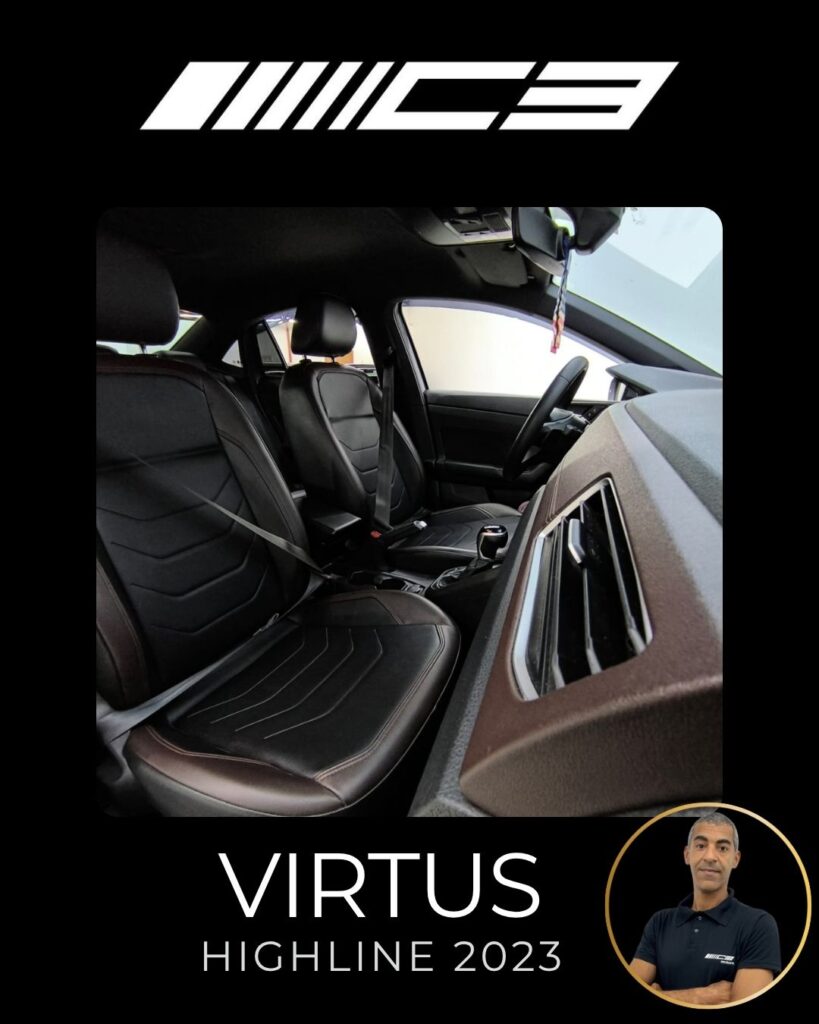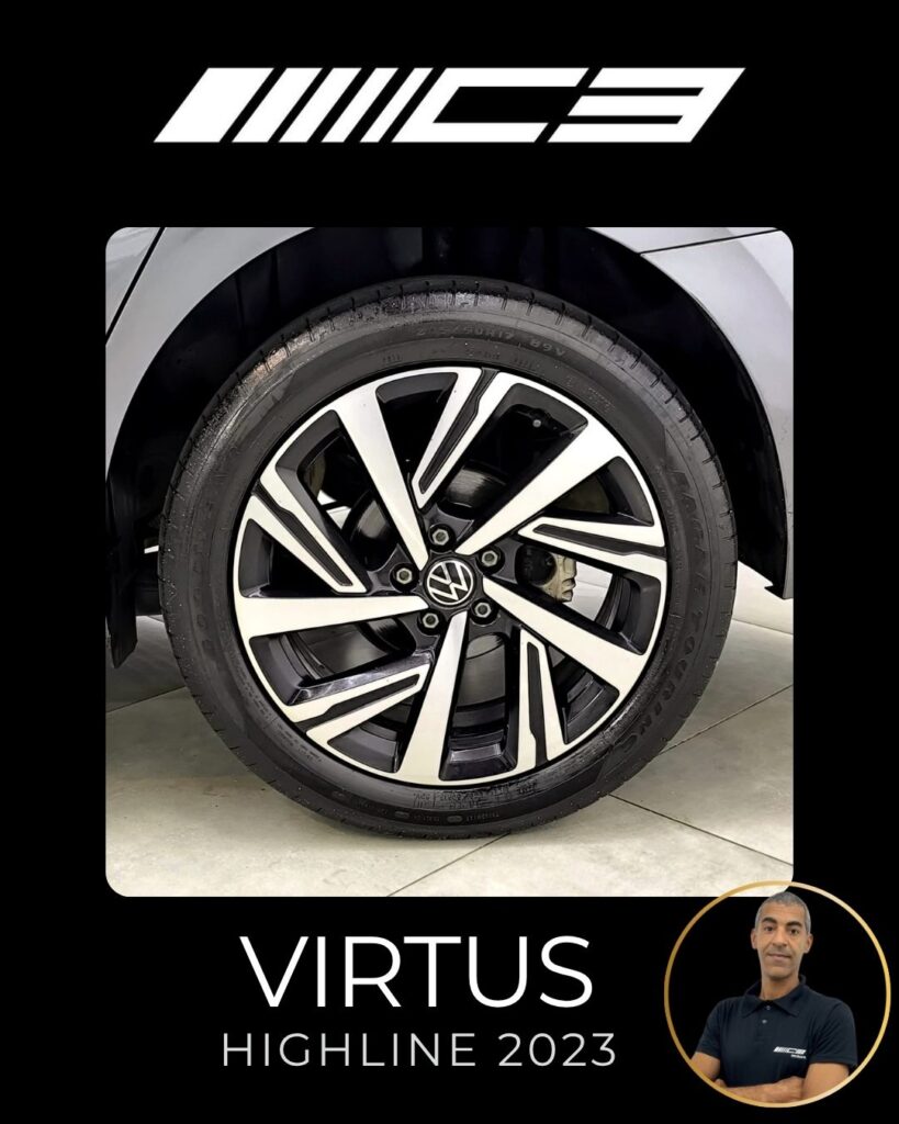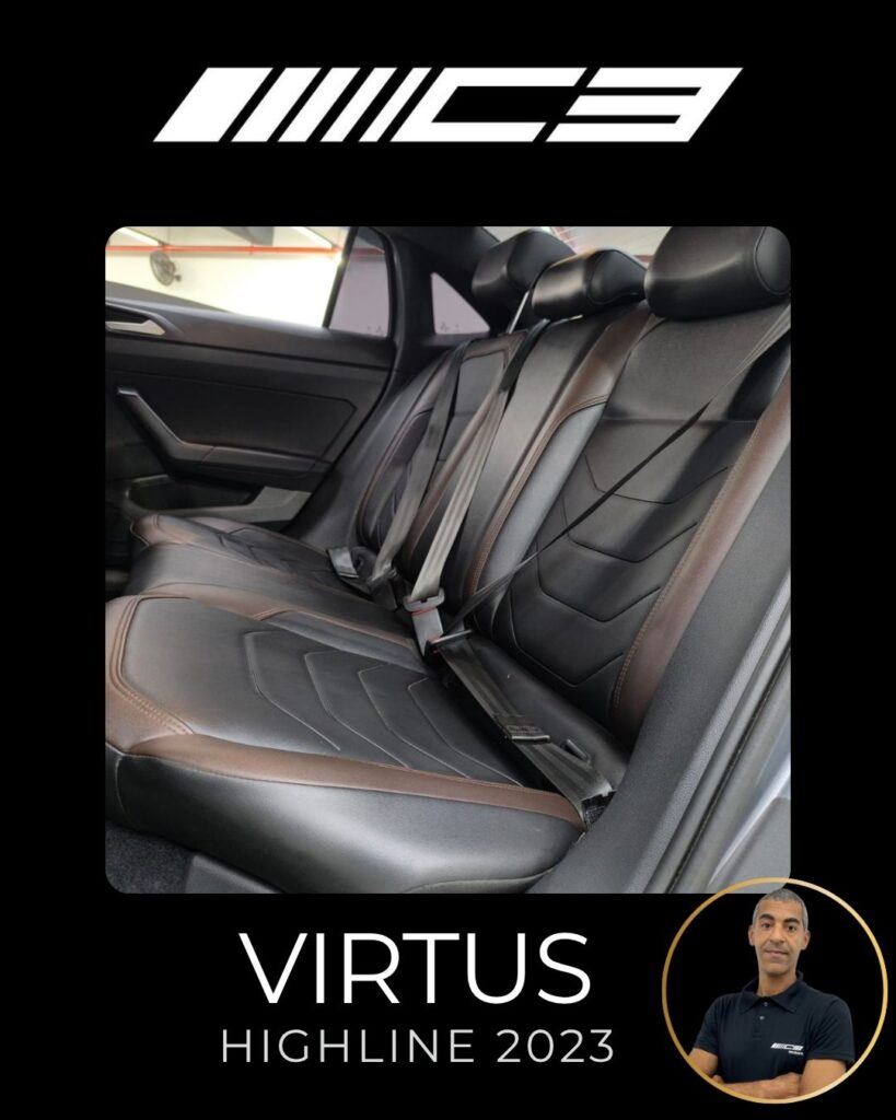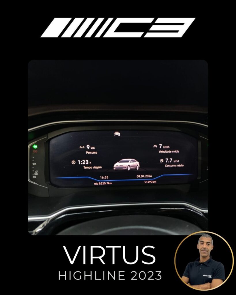O VW Virtus Highline 2023 destaca-se pelo motor 200 TSI, visual renovado com faróis full LED, painel digital de 10,25”, central VW Play e pacote ADAS (piloto automático adaptativo/frenagem automática). O sedã traz rodas aro 17″, bancos em couro, climatronic touch e, como diferencial, as três primeiras revisões gratuitas